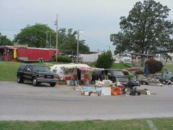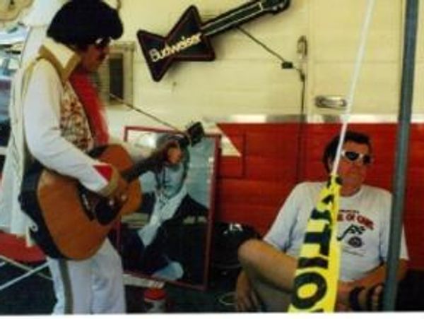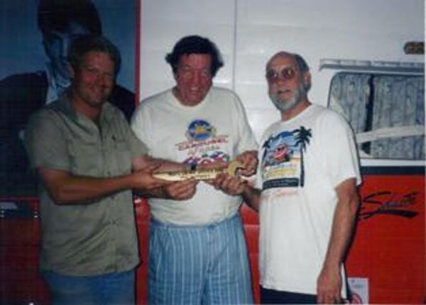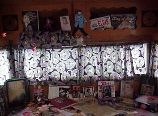 The Elvis Shrine (a 1962 Shasta) was purchased by the Tulsa boys (Bird, Phil Henry and Kenny Miller) in 1994 at the Springfield MO swapmeet. A great group of guys created it and we are still good friends and visit at various meets. The hot rod in front (a '35 Ford) belonged to Jim Mezel who obviously used the same can of paint for both projects.
